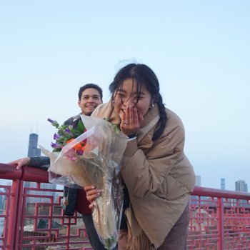 Tina: We love to travel, so when Eddie and I planned our spring break trip/ birthday trip in March of 2023 it was a no-brainer to revisit one of our favorite cities in the USA, Chicago! I had no clue that he was planning to propose. We had been talking about rings the year before and the conversation fizzled out so I thought we were putting a pin in it. It took me by complete surprise since I thought it was going to be later in the year. That day we spent exploring and shopping in our favorite neighborhood and then went to picnic in Ping Tom Memorial Park. The day was cloudy but the sun came up to warm us up as we sat, enjoyed our tea, and worshiped. We went through memory lane together looking at photos and came to the present. At that moment, he kneeled. Eddie did an amazing job and was so thoughtful.