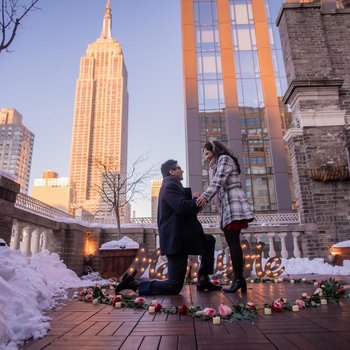 Then, one cold weekend in January, Ganesh mentioned to Kritika that they should visit his parents in Long Island for the weekend. Unsuspecting, Kritika happily packed her things. When they got to Long Island, Ganesh casually mentioned that he had made reservations at a restaurant in the city and that they would be going to a speakeasy bar beforehand. Kritika dressed in her speakeasy finest and they boarded the train to Manhattan. Once there, Ganesh led her to an unmarked building (good thing he had known her for almost two years at this point, otherwise it may have raised some red flags!), but Kritika still didn’t suspect a thing. After all, she thought, don’t all speakeasy bars have elevators that you need to call ahead to hail, and very specific timings that you can enter? She followed Ganesh into the elevator of the building, watched as he pressed the “12th floor”, and followed him as he walked out onto a deck overlooking the Empire State Building. And then she saw the sign. “Marry me?” it said. And she watched as Ganesh bent down on one knee and asked her the most touching question of her life.