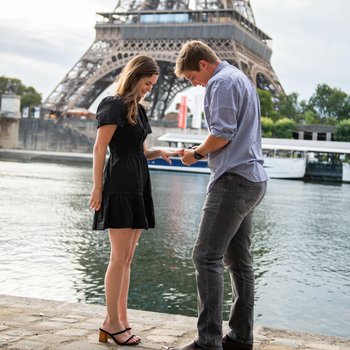 Last summer, Riley went on a backpacking trip to Europe with his sister to cross it off their bucket lists and celebrate his graduation. Riley convinced Macie to join them at the end of their trip to go to Switzerland, France, and Italy. He carefully carried the engagement ring with him across Europe for 4 weeks before Macie arrived. While in Paris, both Macie and Riley were enamored by the Eiffel Tower sparkling each night. Riley made sure that they saw the Eiffel Tower sparkle each night, several times a night as it sparkles on the hour for five minutes. The night before the proposal, Riley insisted that they go to the bottom of the tower and watch it shine at midnight. The next day, on August 21, 2022 they explored the city all day with a trip to a couple of amazing restaurants, the aquarium, and a walk to the tower. Dinner reservations were made at a popular restaurant right in front of the Eiffel Tower, so by the afternoon it was time to walk back to the hotel and get ready for dinner.