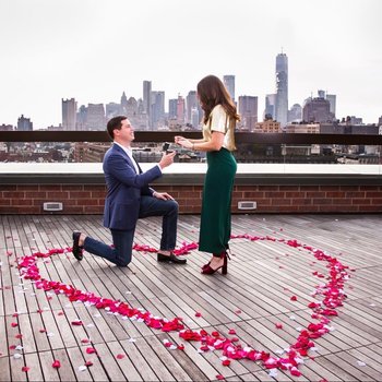 Darren proposed on 12/1/18 on the rooftop of our first apartment together in NoHo, Manhattan. My family was already planning to be in town for a festive Christmas-in-the-city weekend, and I was led up to the roof around 2pm to "take family Christmas card photos". Kate, my sister, took me up the elevator and when the doors opened, the hallway was lined with votives and rose petals leading out to the deck. Darren awaited encircled in a heart made of rose petals and proceeded to ask if I would spend the rest of my life with him. Later that evening he coordinated a surprise dinner at Casa Apicii in Greenwich Village, followed by a surprise party with all our friends and family in the city.